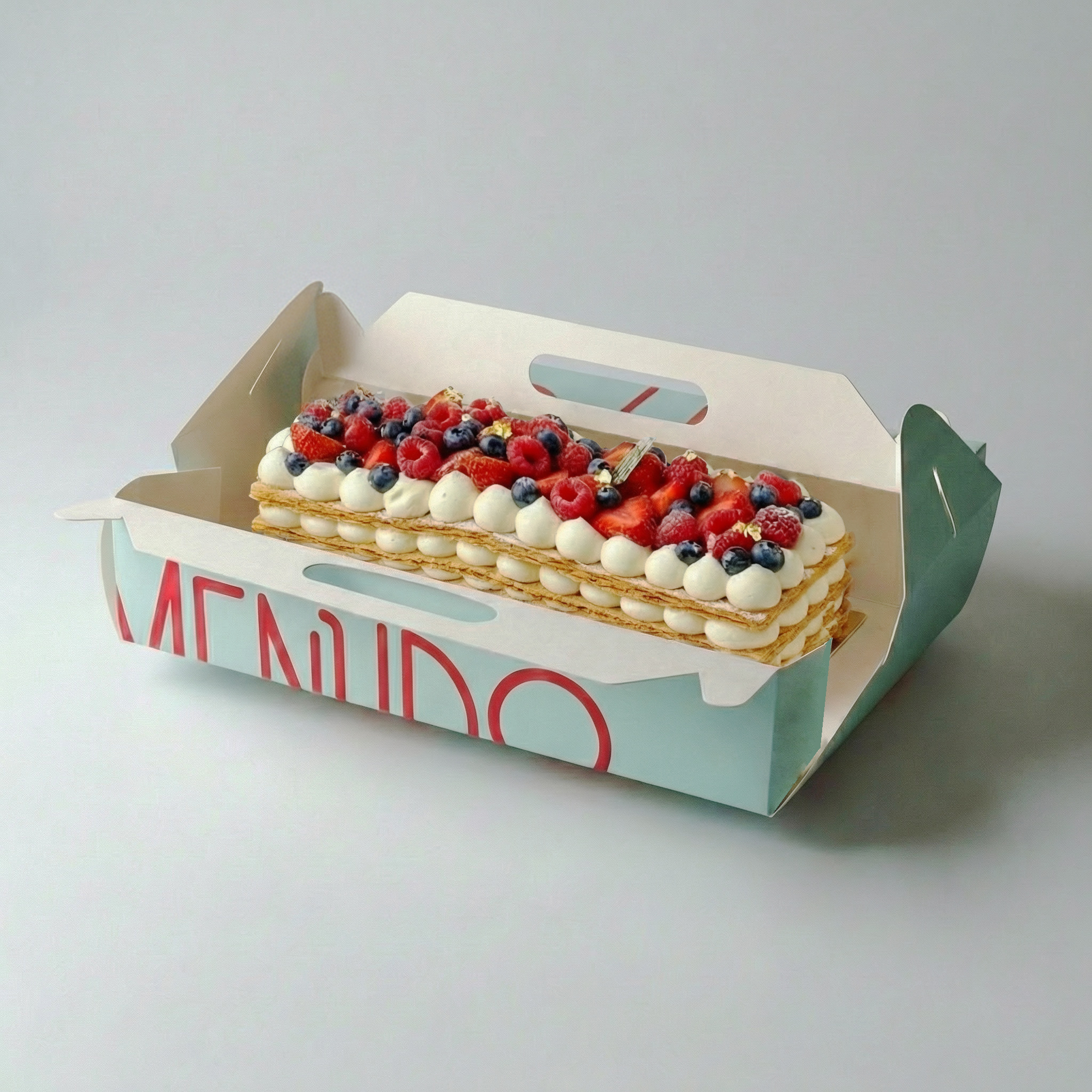 Caja para tartas con clásico cierre mariposa, que permite su apertura total. Una vez cerrada proporciona un asa que facilita su transporte.